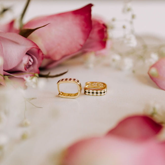 The Times Square Reversible Hoops are made of high quality gold vermeil metal and are hypoallergenic and good for sensitive ears. On the front side they feature a unique black and white diamond checker pattern, and on the other side feature a dainty gold cutout daisy pattern. They can be worn in either direction, meaning you get two earring styles for the price of one! Outer diameter is 10mm.